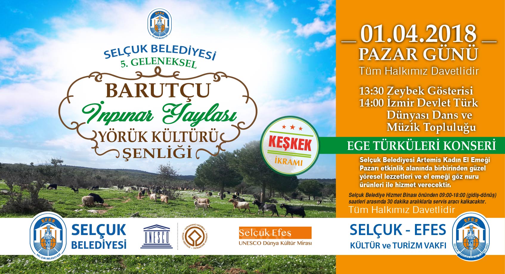 Selçuk'un Barutçu Mahallesi'nde 1 Nisan Pazar Günü düzenlenecek olan 5. Geleneksel Barutçu İnpınar Yaylası Yörük Kültürü Şenliği saat 13.30'da Zeybek Gösterisi ile başlayacak. Saat 14.00'de İzmir Devlet Türk Dünyası Dans ve Müzik Topluluğu Ege Türkülerini seslendirecek.