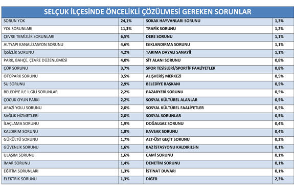 Selçuk merkez ile belde ve köylerinde yapılan araştırmaya göre, önemli üç sorun ortaya çıktı.Ankete katılan vatandaşların görüşlerine göre parklardaki çocuk oyun alanları, şehir içi ve arazi yolları ile sivrisinek, karasinek, yakarca ve haşere ile mücadele konuları en önemli üç sorun olarak belirlendi.
