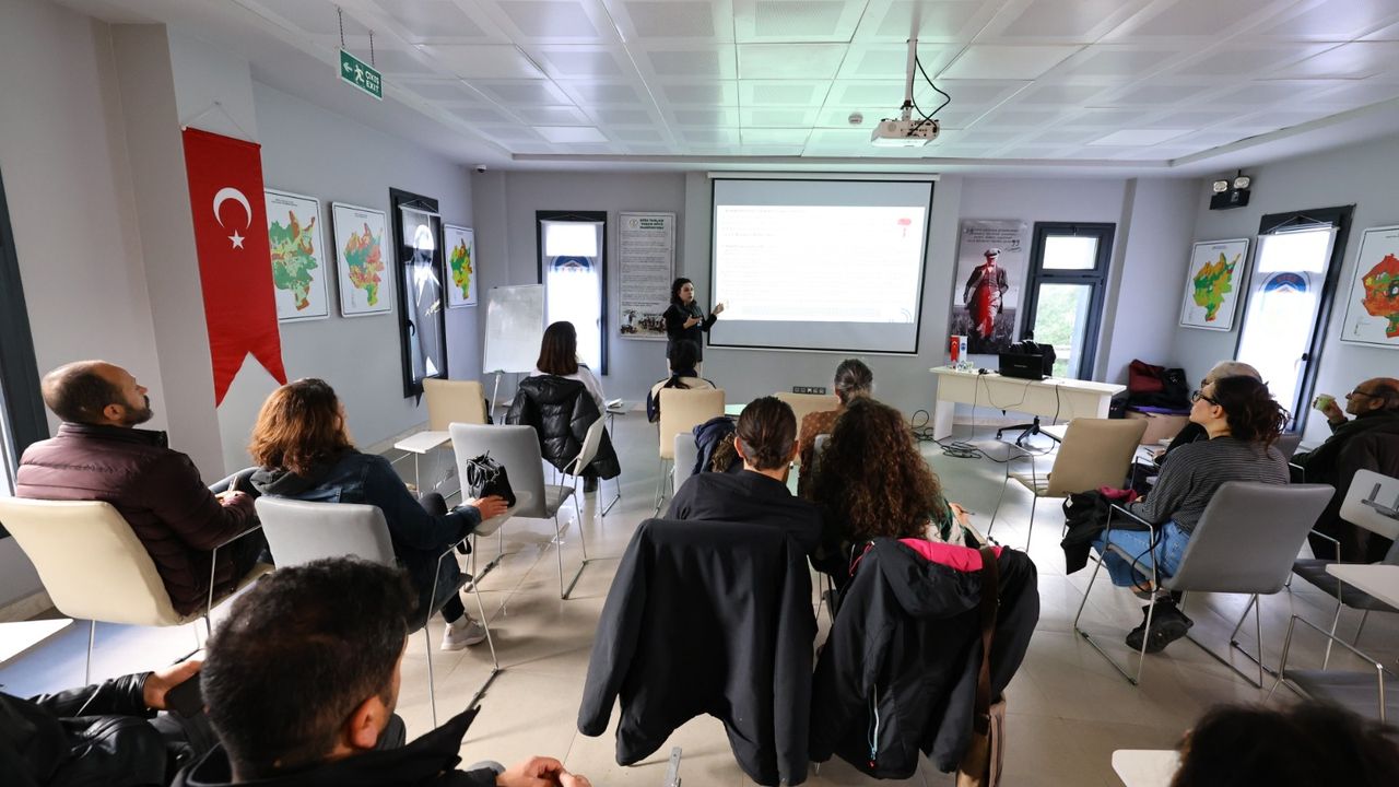 Organik Tarım Teknikeri Elif Ceylan Çelik Sönmez’in anlatımıyla gerçekleşen eğitimde mantar çeşitleri ve yetişme koşulları, kompostlaştırma işleminin başlıca adımları, kompost hazırlığı, örtü toprağı ve örtü toprağının dezenfeksiyonu gibi birçok başlık ele alındı.