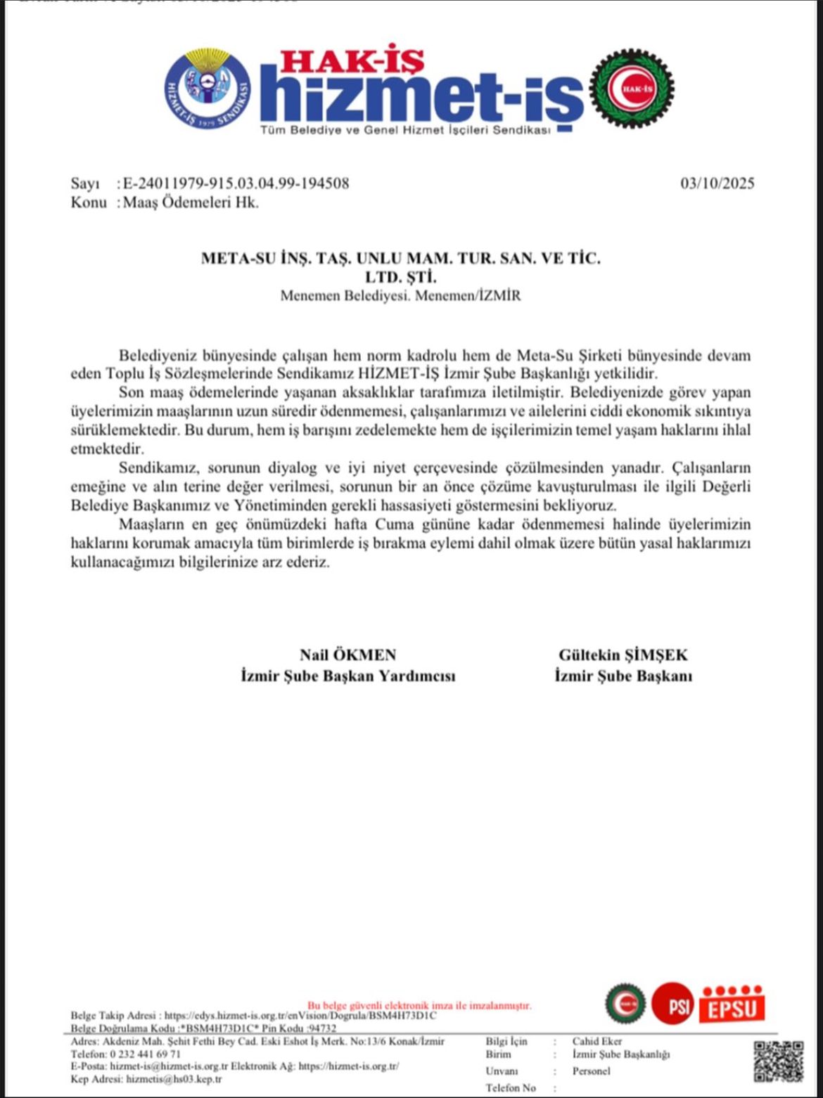 Metehan UD/ EGEDESONSÖZ – AK Partili Menemen Belediyesi’ne ait Meta-Su Şirketi’nde örgütlü Hak-İş Konfederasyonu’na bağlı Hizmet-İş Sendikası İzmir Şubesi, yaşanan maaş gecikmelerinden kaynaklı belediyeye yazı gönderdi.