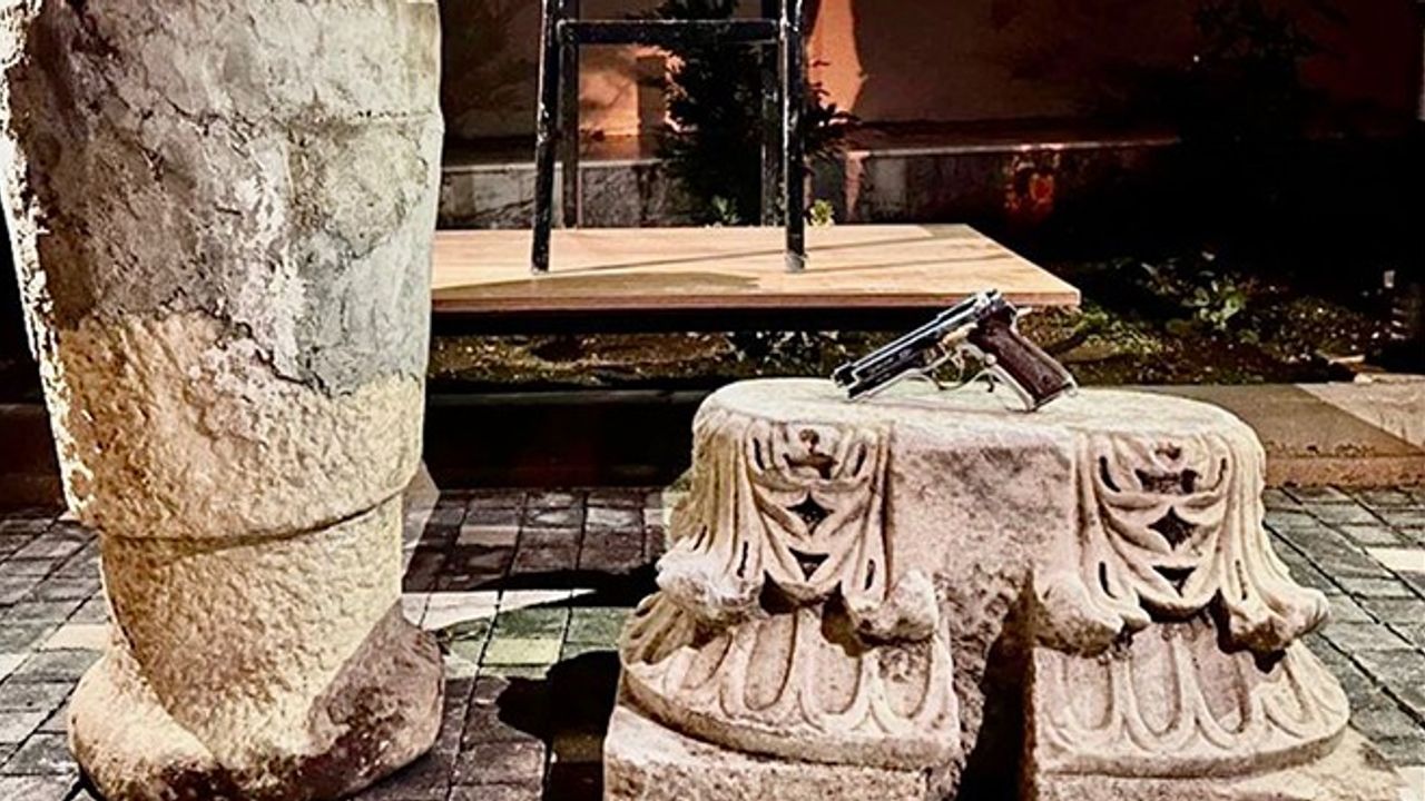Şüphelinin ikametinde yapılan aramada Roma dönemine ait 2 parça sütun başlığı ve kurusıkı tabanca ele geçirildi.