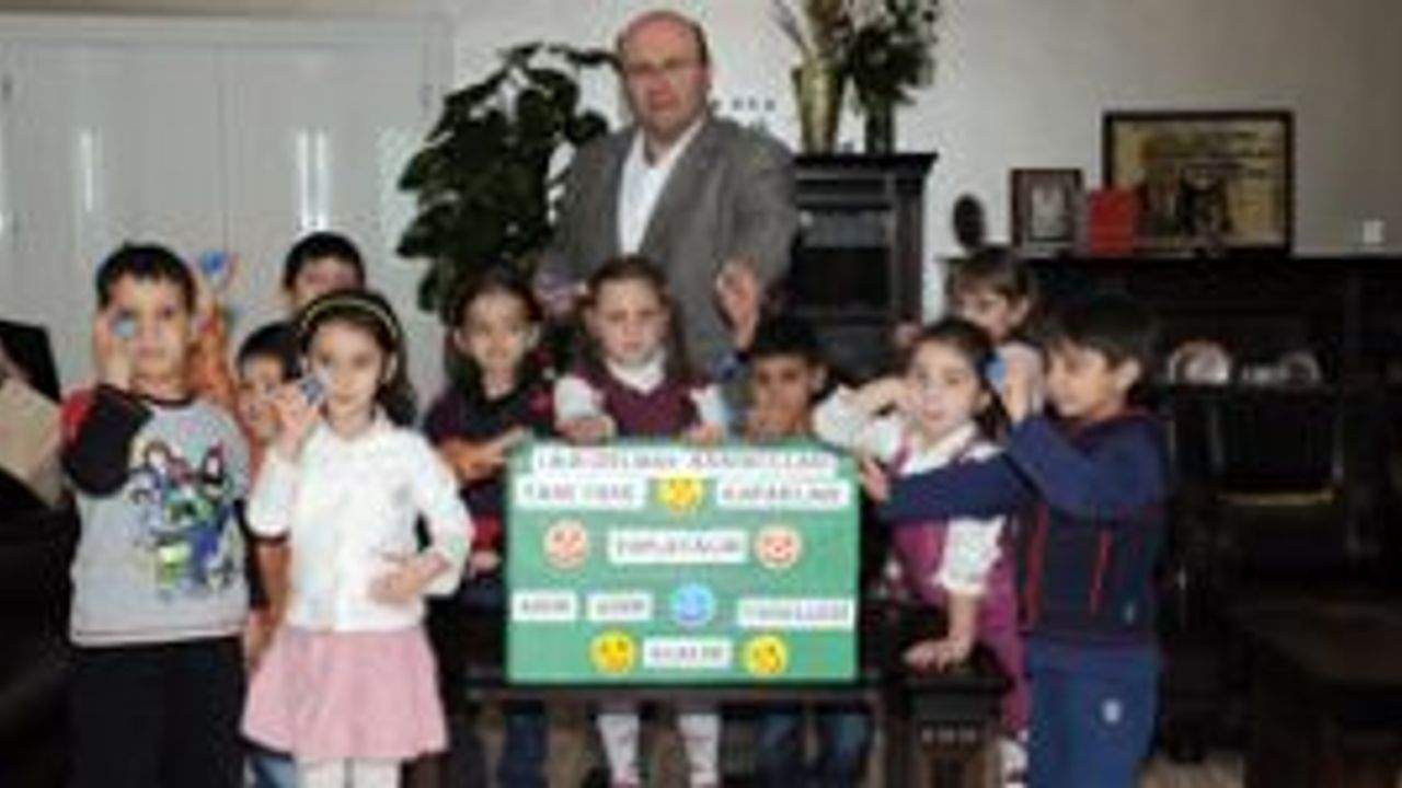 İZMİR - Engelliler için yürütülen 'Tane Tane Kapakları Toplayalım, Engelleri Aşalım' kampanyasına destek olarak kapak toplayan İzmir Büyükşehir Belediyesi İzelman Sabiha Gökçen Kreş ve Anaokulu'nun minik öğrencileri Çiğli Belediye Başkanı Metin Solak'ı ziyaret etti. Kendilerinin yaptığı kapak toplama kutusunu Başkan Solak'a teslim eden minikler, belediyeden de kampanyaya destek istedi. Kapakların satışından elde edilen gelirle engellilere sandalye alımını sağlayan kampanyaya gönülden destek olacaklarını belirten Başkan Solak, miniklerin sosyal sorumluluk projelerine destek olmalarının önemini vurguladı. 'Küçük yaşta toplumsal projelere destek olarak çalışma başlatan miniklerimiz, çok önemli bir konuya dikkat çekmiş oluyor' diyen Başkan Solak, kapak toplama kutusunu belediye başkanlık katına koyarak kampanyaya destek oldu. Başkan Solak diğer birimlerde de kampanyaya destek sağlanacağını ifade etti.