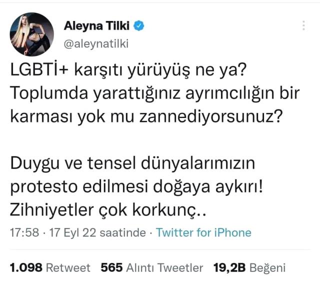 Aleyna Tilki, sosyal medya hesabında dün yaptığı paylaşımda, İstanbul'da bugün yapılan LGBTİ artı karşıtı yürüyüşe ilişkin şu mesajı yayınlamıştı: 'LGBTİ artı karşıtı yürüyüş ne ya? Toplumda yarattığınız ayrımcılığın bir karması yok mu zannediyorsunuz? Duygu ve tensel dünyalarımızın protesto edilmesi doğaya aykırı! Zihniyetler çok korkunç.'