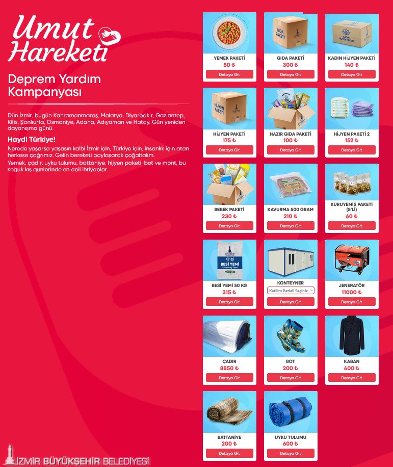 İzmir Büyükşehir Belediyesi'nin, deprem felaketinin hemen sonrasında başlattığı yardım seferberliği devam ediyor. İlk günden itibaren İzmirlilerin ve Büyükşehir Belediyesi'nin sağladığı binlerce ton insani yardım malzemesinin depremzedelere ulaştığını söyleyen İzmir Büyükşehir Belediye Başkanı Tunç Soyer, başlattıkları Umut Hareketi adlı yardım kampanyasına destek çağrısı yaptı.