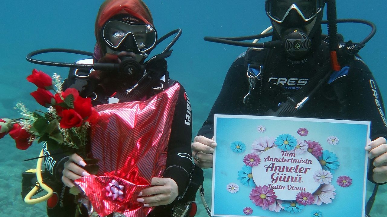 Muğla'nın Fethiye ilçesinde bir grup dalgıç, Anneler Günü'nü Dalyan Koyu’nda 5 metre derinlikte açtıkları dövizle kutladı.