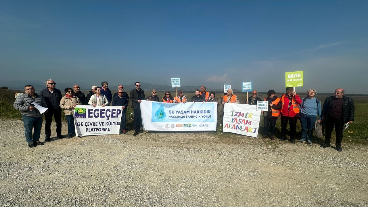 EGEDESONSÖZ - 22 Mart Dünya Su Günü’nde Tahtalı Barajı önünde, TMMOB İzmir İl Koordinasyon Kurulu, İzmir Tabip Odası, İzmir Barosu, Konak Kent Konseyi, Ege Kent Konseyleri Birliği, EGEÇEP ve İzmir Yaşam Alanları ortak basın açıklaması yaptı. Açıklamayı, Ege Kent Konseyleri Birliği ve Konak Kent Konseyi Başkanı Hamit Mumcu okudu.
