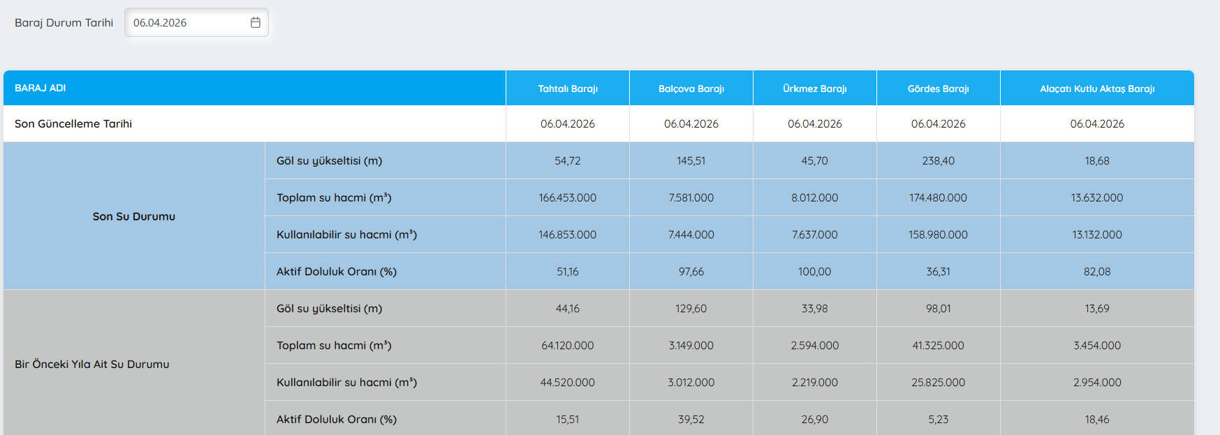 Balçova Barajı’nda aktif doluluk oranı yüzde 97,66, Ürkmez Barajı'nda aktif doluluk oranı yüzde 100, Alaçatı Kutlu Aktaş Barajı'nda ise aktif doluluk oranı yüzde 82,08 olarak ölçüldü.