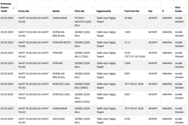 2 Ekim 2024 itibarıyla uygunsuzluk tespit edilen her ürün, bakanlığın internet sitesinden paylaşılıyor.