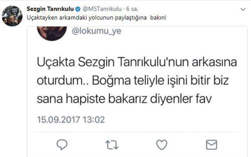 Ankara'dan İstanbul'a uçakla yolculuk eden Tanrıkulu dün, 1A numaralı koltuğa oturdu. Tanrıkulu'nun arkasındaki 2A numaralı koltukta oturan Gazi Üniversitesi Hukuk Fakültesi Araştırma Görevlisi Burak Doğan, Twitter'da kullandığı '@lokumu_ye' hesabından 'Uçakta Sezgin Tanrıkulu'nun arkasına oturdum.. Boğma teliyle işini bitir biz sana hapiste bakarız diyenler fav' mesajını paylaştı.