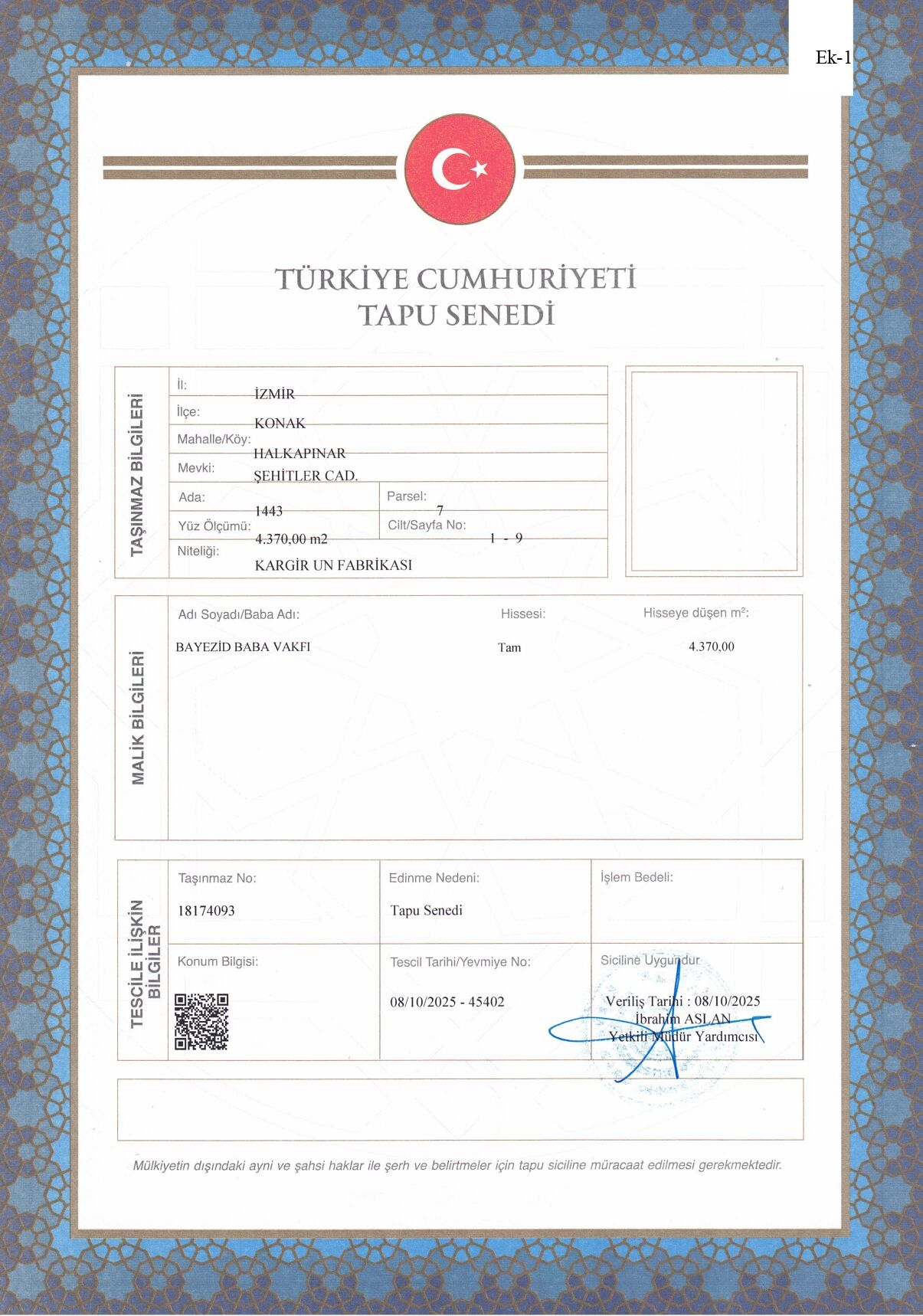 Vakıflar Genel Müdürlüğü’nün “Bayezid Baba Vakfı” adına tescillediği yerin resmi kayıtlara göre 4 bin 370 metrekare alan olduğu görüldü. Konak Halkapınar Şehitler Caddesi üzerinde bulunan bina resmi kayıtlara göre “Kargir Un Fabrikası” görünüyor. Tarih itibariyle 8 Ekim 2025 tarihinde yapılan işlemde Konak Tapu Müdür Yardımcısı İbrahim Aslan’ın imzası yer alıyor. Edinme nedeni “Tapu Senedi” olarak ifade edilen işlemde vakfın hissesi ise “tam” olarak görünüyor.