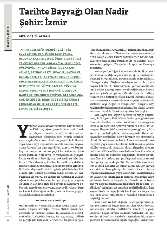 Soyer'in 'akademik bir çalışma' diye tanımladığı makaleyi yazan Tarih Vakfı Başkanı ve İstanbul Üniversitesi Öğretim Üyesi Prof. Dr. Mehmet Ö. Alkan'ın bayrak konusundaki çalışmaları dikkat çekiyor. Toplumsal Tarih Dergisi'nin Mart ayı sayısında konuya geniş yer veren Alkan'ın, 'Tarihte Bayrağı Olan Nadir Şehir: İzmir' isimli ayrıntılı makalesinde şehirlerin bayrakları konusu ayrıntılı bir şekilde irdeleniyor.