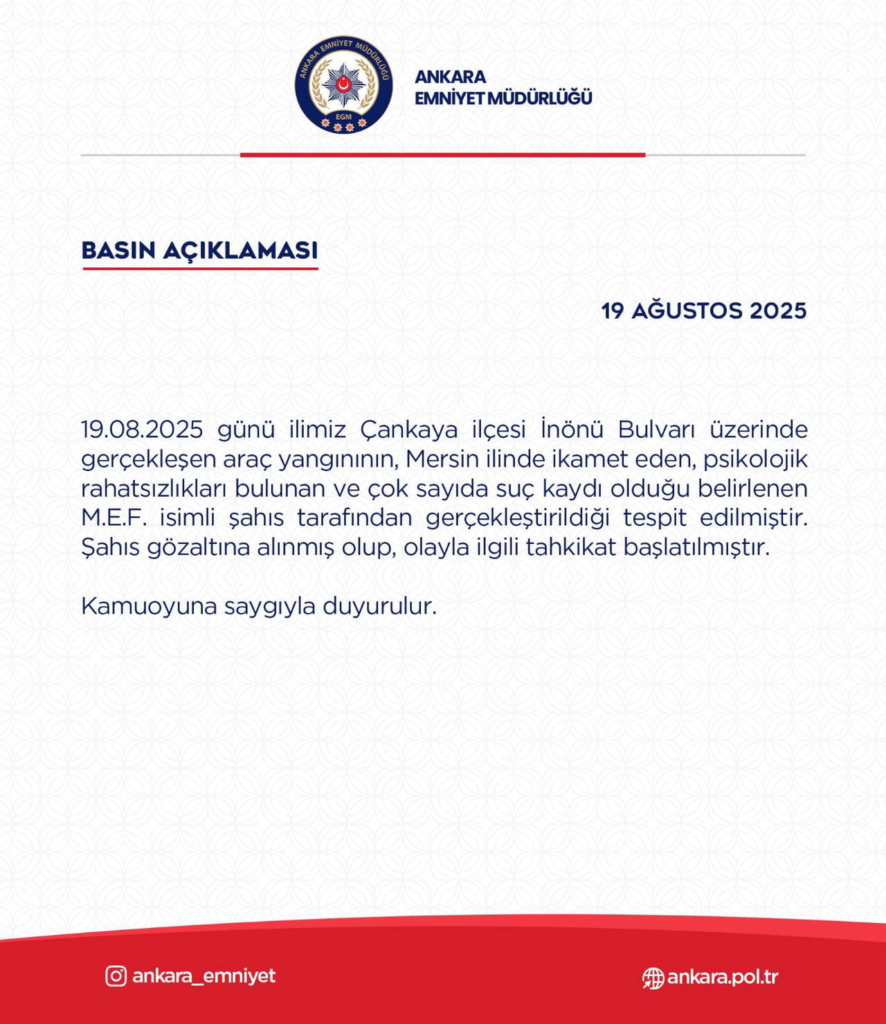 Ankara Emniyet Müdürlüğü'nden yapılan açıklamada, "19.08.2025 günü ilimiz Çankaya ilçesi İnönü Bulvarı üzerinde gerçekleşen araç yangınının, Mersin ilinde ikamet eden, psikolojik rahatsızlıkları bulunan ve çok sayıda suç kaydı olduğu belirlenen M.E.F. isimli şahıs tarafından gerçekleştirildiği tespit edildi.