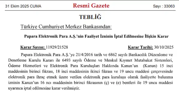 Türkiye Cumhuriyet Merkez Bankası (TCMB), Papara'nın faaliyet iznini iptal etti.