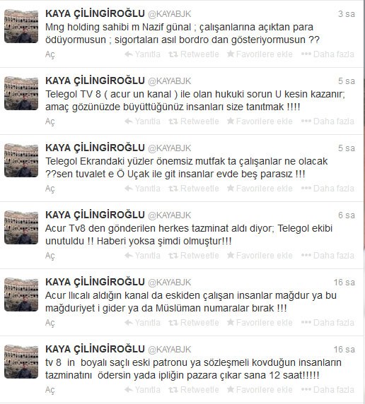 Kaya Çilingiroğlu ayrıca TV 8'in eski patronu Mehmet Nazif Günal'a 'Ya kovduğun sözleşmeli insanların tazminatını ödersin ya da senin ipliğini pazara çıkartırım' mesajını attı.