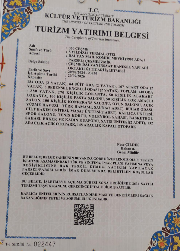 Proje için ayrıca Kültür ve Turizm Bakanlığı’ndan 20 Temmuz 2024 tarihinde ‘Turizm Yatırım Belgesi’ de alınmış. Çeşme Belediyesi tarafından düzenlenen evraka göre parsel imar planlarında ‘turistik tesis’ alanında kalıyor.