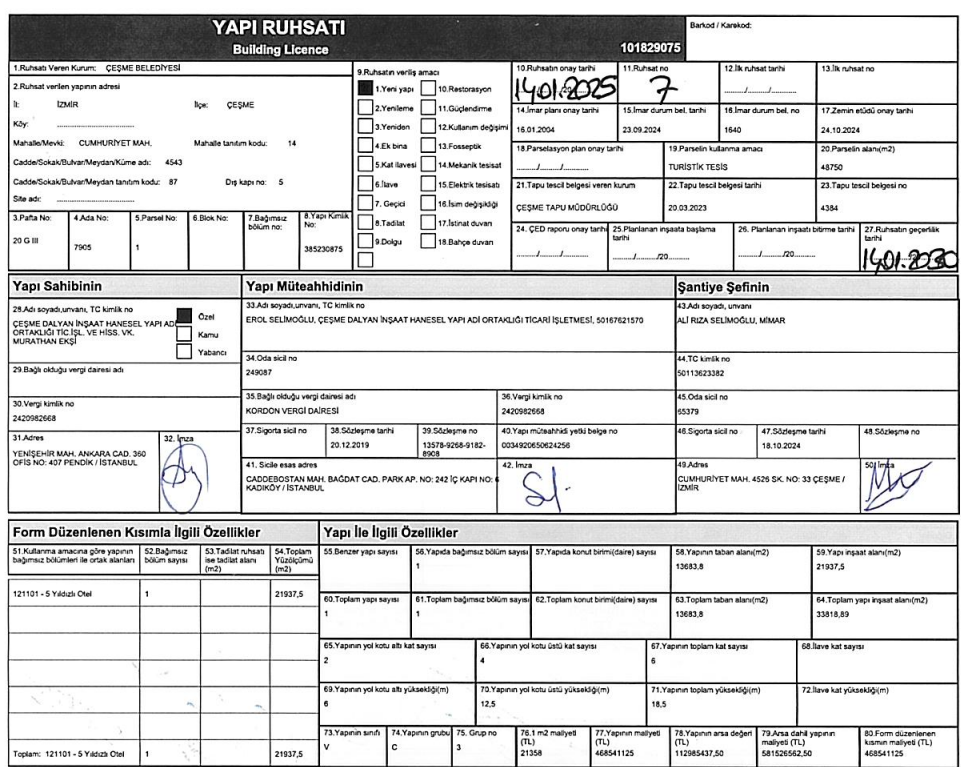 Parselin 233/1560 hissesi Çeşme Dalyan İnşaat Hanesel Yapı Adi Ortaklığı Ticari İşletmesi’ne ait iken proje için Çeşme Belediyesi 14 Ocak 2025 tarihinde yapı ruhsatı vermiş. Ruhsatta yapı ‘5 yıldızlı otel’ olarak belirtilmiş. Proje kapsamında inşa edilecek yapılan bir kısmı 2 katlı iken bir kısmı ise 3 katlı inşa edilecek.