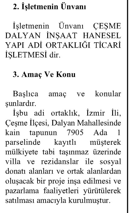 Amaç kısmında “İş bu adi ortaklık, İzmir İli Çeşme İlçesi, Dalyan Mahallesinde kain tapunun 7905 Ada 1 parselinde kayıtlı müşterek mülkiyete tabi taşınmaz üzerinde villa ve rezidanslar ile sosyal donatı alanları ve ortak alanlardan oluşacak bir proje inşa edilmesi ve pazarlama faaliyetleri yürütülerek satılması amacıyla kurulmuştur” ifadeleri yer alıyor.