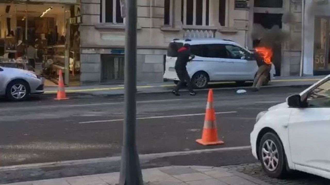 Sosyal medyayı sarsan inanılmaz görüntü... Tinerci olduğu iddia edilen bir kişinin bir vatandaşı ateşe verdiği görüntüler sosyal medyayı şoke etti. Görüntülere göre montu bir anda alevler içinde kalan vatandaş kısa süre içinde polis tarafından söndürüldü. Görüntüleri çeken Murat Efe, 'Yoldan geçen herkese bulaşıyordu. Su attığını zannettik. Bir anda alevler içinde kaldı. Polis müdahale etti, kısa süre içinde söndürüldü' dedi.