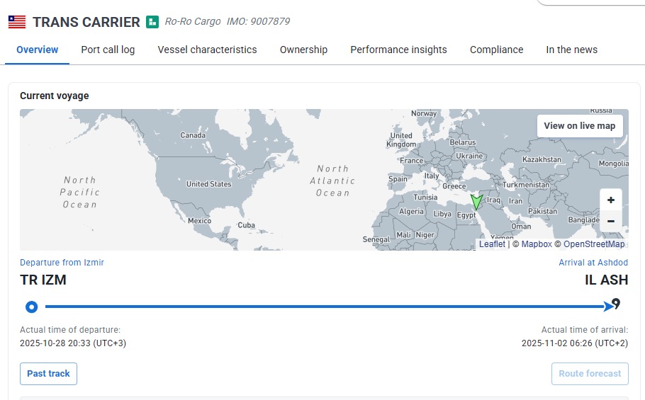 “TRANS CARRIER” isimli, Liberya bayraklı kargo gemisi 28 Ekim 2025 tarihinde saat 20.33’te İzmir Limanı’ndan kalkmış ve 2 Kasım 2025 tarihinde saat 06.26’da İsrail’in Ashdod Limanı’na ulaşmıştır.