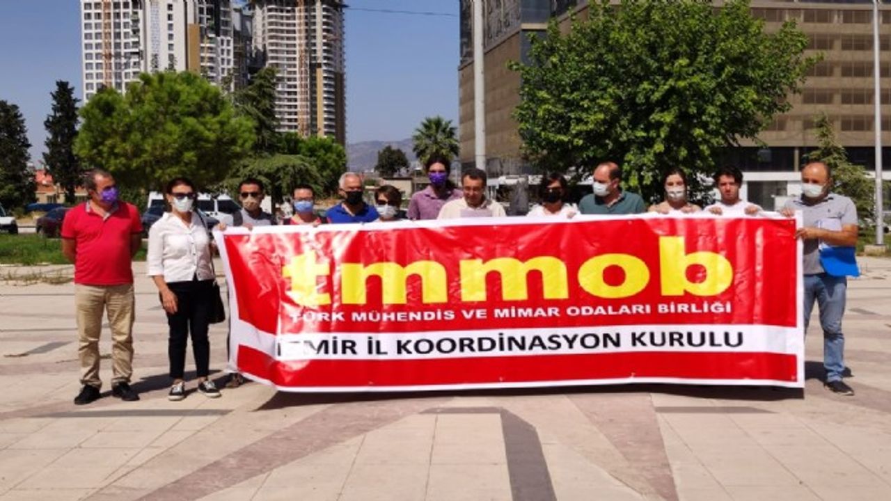 EGEDESONSÖZ- Türk Mühendis ve Mimar Odaları Birliği (TMMOB) İzmir İl Koordinasyon Kurulu, 'TMMOB Mühendis, Mimar ve Şehir Plancıları Dayanışma Günü' dolayısıyla Yeni Şehir Gıda Çarşısı Birlik Parkı'nda basın açıklamasında bulundu.