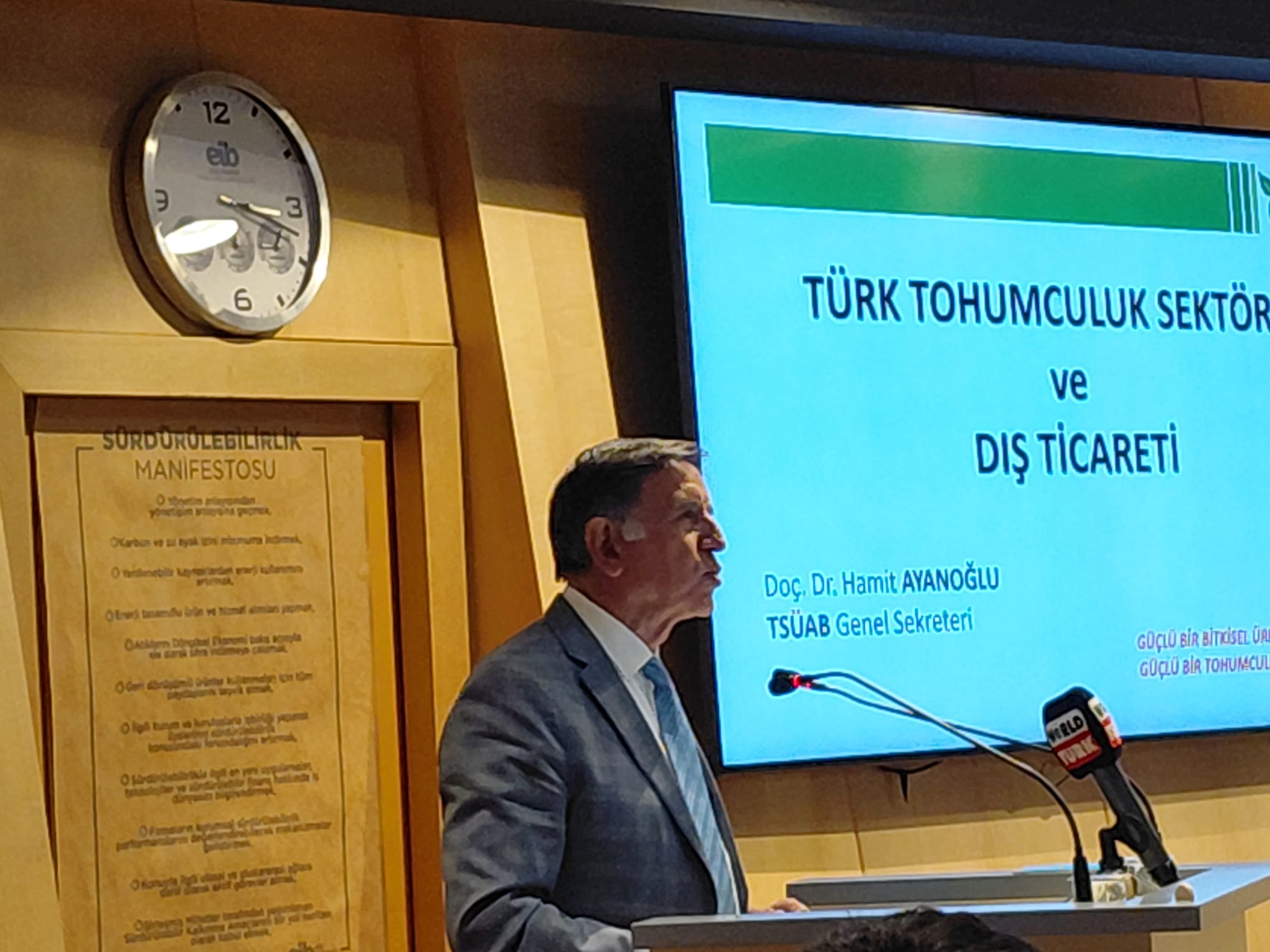 Tohum Sanayicileri ve Üreticileri Alt Birliği (TSÜAB) Genel Sekreteri Doç Dr. Hamit Ayanoğlu, tohum sektörüne dair konuşma yaptı. Verilerle bilgilendirmede bulunan Ayanoğlu, 2030 yılında 500 milyon tonluk ihracata ulaşacaklarını tahmin ettiklerini ifade etti.