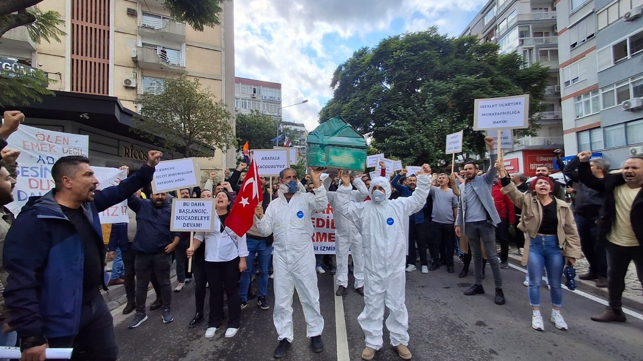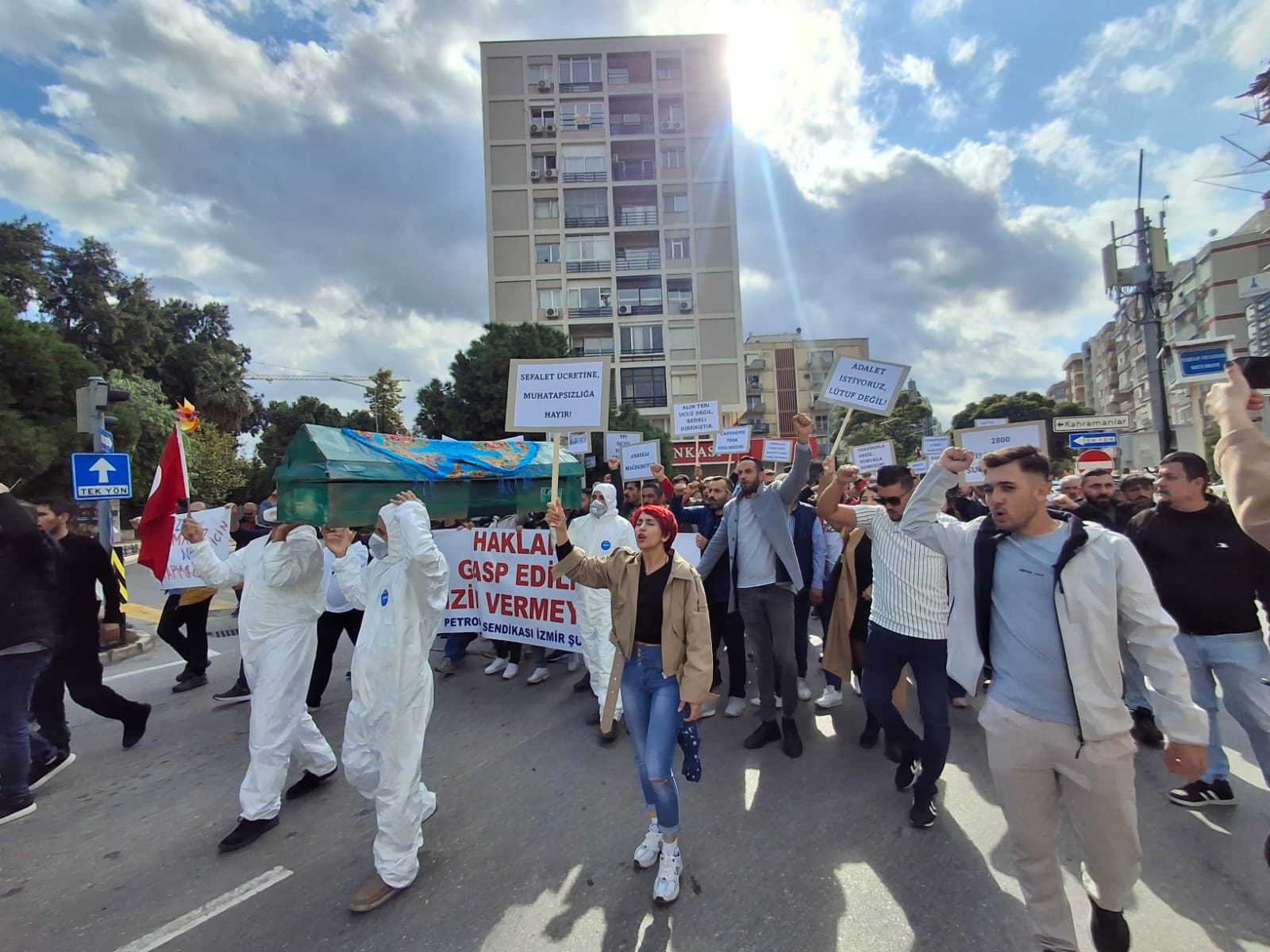 Cumhuriyet Gazetesi'nden Ece İçmez'in haberine göre, Petrol-İş Sendikası İzmir Şubesi üyesi işçiler, yıllardır kâr açıklayan şirketin kendilerine düşük ücret ve zor koşullarda çalışmalarını istediğini belirtti. İşçiler Türk-iş önünde buluşarak tabut eşliğinde Alsancak garına yürüdü. Aralarında 9 aylık hamile işçi Mihriban Turgun'un da olduğu işçiler sık sık "Bakanlık uyuma işçilere sahip çık" ,"Hak, hukuk, adalet", "Bize ekmek yoksa size pasta yok" sloganları attı.