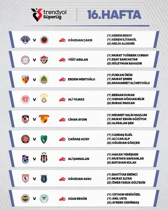 Trendyol Süper Lig'de 16. hafta maçlarının hakemleri belli oldu.