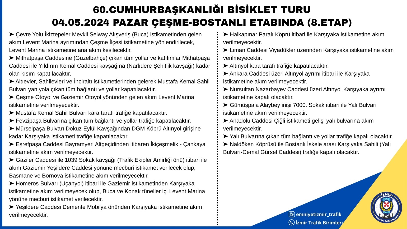 ➤ Çeşme Kalesi başlangıç noktasından itibaren 1016 sokak trafiğe kapatılacaktır. ➤ 1065 sokak trafiğe kapatılacaktır. ➤ 2122 sokak İzmir Alaçatı istikameti trafiğe kapatılacak olup, ters istikamet geliş - gidiş çift yön olarak trafiğe açık olacaktır. ➤ Çeşme Asfaltı Caddesi İzmir Alaçatı istikameti trafiğe kapatılacak olup, ters istikamet geliş gidiş çift yön olarak trafiğe açık olacaktır. ➤ 5193 sokak trafiğe kapatılacaktır. ➤ 5152 sokak trafiğe kapatılacaktır. ➤ 6000 sokak trafiğe kapatılacaktır. ➤ Alaçatı Gişeler Kavşağından İzmir-Çeşme Devlet Karayolu istikametine akım verilmeyecek olup trafik akımı 1060 Sokak istikametine yönlendirilecektir. ➤ Çeşme İlçesi istikametinden gelen akım Alaçatı Gişeler, İzmir-Çeşme Devlet Karayolu bağlantı kolundan itibaren Alaçatı Kutlu Aktaş Barajı ve İYTE Kavşağı istikametine gönderilmeyecek olup trafik akımı Alaçatı Gişeler üzerinden İzmirÇeşme Otoyoluna yönlendirilecektir. ➤ Çeşme İlçesi Şifne Köprüsünden Reisdere istikametine olan akım kesilecektir. ➤ İzmir/Çeşme Devlet Karayolu Germiyan istikametine olan karayolu kesiminde Ildır-Kadıovacık-Barboros Mahalleri istikametine olan akım kesilecektir. ➤ Zeytinler Otoyol Kavşağında, İzmir Çeşme Otoyolu üzerinden gelen akım İzmir-Çeşme Devlet Karayoluna gönderilmeyecektir. ➤ İzmir-Karaburun Devlet Karayolu Gülbahçe Kavşağı, Karaburun ve Gülbahçe istikametinden gelen akıma Karaburun ve Gülbahçe istikametine mecburi yön verilecek olup İYTE Kavşağı yönünden İzmir ve Çeşme istikametlerine akım verilmeyecektir. ➤ İzmir-Çeşme Devlet Karayolu, İYTE Kavşağı, İzmir istikametinden Çeşme istikametine akım verilmeyecek olup trafik akımı Karaburun ve Gülbahçe istikametine yönlendirilecektir. ➤ Karaburun Otoyol Kavşağında, İzmir-Çeşme Otoyolu Üzerinden geliş ve gidiş istikametlerinden gelen akım İzmir-Çeşme Devlet Karayoluna (İçmeler istikametine) gönderilmeyecektir. ➤ İzmir-Çeşme Devlet Karayolu üzerinde yer alan İçmeler, İzsu, Göçmen Konutları, İtokent, Arm Harfiyat, Özbek (Sanayi), Uğur Mumcu, Adres, Ted İzmir Koleji ve Zeytin Alanı Kavşaklarından İzmir istikametine bağlanan sokak ve ara yollardan İzmir istikametine araç çıkışına müsaade edilmeyecektir. ➤ Kekliktepe Otoyol Kavşağında, İzmir-Çeşme Devlet Karayoluna ve Manzara Caddesi Yan Yol istikametine akım verilmeyecek olup trafik akımı Nur Dikmen Caddesi ve Manzara Caddesi istikametine yönlendirilecektir. ➤ Güzelbahçe Otoyol Kavşağında, İzmir Çeşme Otoyolu üzerinden geliş ve gidiş istikametlerinden Güzelbahçe/Kahramandere Kavşağı İstikametine olan akımın kavşak istikametlerine olan Bağlantı Kolu başlangıçlarından itibaren trafik akımı Çeşme ve İzmir istikametlerine yönlendirilecektir. ➤ İzmir-Çeşme Otoyolu Levent Marina Kavşak yaklaşımı, Çeşme istikametinden gelen akım Aydın ayrımından Gaziemir İlçesi istikametine yönlendirilecek, Levent Marina istikametine ana akım kesilecektir. ➤ Çevre Yolu İkiztepeler Mevkii Selway Alışveriş (Buca) istikametinden gelen akım Levent Marina ayrımından Çeşme İlçesi istikametine yönlendirilecek, Levent Marina istikametine ana akım kesilecektir. ➤ Mithatpaşa Caddesine (Güzelbahçe) çıkan tüm yollar ve katılımlar Mithatpaşa Caddesi ile Yıldırım Kemal Caddesi kavşağına (Narlıdere Şehitlik kavşağı) kadar olan kısım kapatılacaktır. ➤ Altıevler, Sahilevleri ve İnciraltı istikametlerinden gelerek Mustafa Kemal Sahil Bulvarı yan yola çıkan tüm bağlantı ve yollar kapatılacaktır. ➤ Çeşme Otoyol ve Gaziemir Otoyol yönünden gelen akım Levent Marina istikametine verilmeyecektir. ➤ Mustafa Kemal Sahil Bulvarı kara tarafı trafiğe kapatılacaktır. ➤ Fevzipaşa Bulvarına çıkan tüm bağlantı ve yollar trafiğe kapatılacaktır. ➤ Mürselpaşa Bulvarı Dokuz Eylül Kavşağından DGM Köprü Altınyol girişine kadar Karşıyaka istikameti trafiğe kapatılacaktır. ➤ Eşrefpaşa Caddesi Bayramyeri Altgeçidinden itibaren İkiçeşmelik - Çankaya istikametine akım verilmeyecektir. ➤ Gaziler Caddesi ile 1039 Sokak kavşağı (Trafik Ekipler Amirliği önü) itibari ile akım Gaziemir Yeşildere Caddesi yönüne mecburi istikamet verilecek olup, Basmane ve Bornova istikametine akım verilmeyecektir. ➤ Homeros Bulvarı (Uçanyol) itibari ile Gaziemir istikametinden Karşıyaka istikametine akım verilmeyecek olup, Buca ve Konak tüneller içi Levent Marina yönüne mecburi istikamet verilecektir. ➤ Yeşildere Caddesi Demente Mobilya önünden Karşıyaka istikametine akım verilmeyecektir. ➤ Halkapınar Paralı Köprü itibari ile Karşıyaka istikametine akım verilmeyecektir. ➤ Liman Caddesi Viyadükler üzerinden Karşıyaka istikametine akım verilmeyecektir. ➤ Altınyol kara tarafı trafiğe kapatılacaktır. ➤ Ankara Caddesi üzeri Altınyol ayrımı itibari ile Karşıyaka istikametine akım verilmeyecektir. ➤ Nursultan Nazarbayev Caddesi üzeri Altınyol Karşıyaka ayrımı istikametine kapalı olacaktır. ➤ Gümüşpala Alaybey inişi 7000. Sokak itibari ile Yalı Bulvarı istikametine akım verilmeyecektir. ➤ Anadolu Caddesi Çiğli istikameti gelişi yalı bulvarına akım verilmeyecektir. ➤ Yalı Bulvarına çıkan tüm bağlantı ve yollar trafiğe kapalı olacaktır. ➤ Naldöken Köprüsü ile Bostanlı İskele arası Karşıyaka Sahili (Yalı Bulvarı-Cemal Gürsel Caddesi) trafiğe kapalı olacaktır.