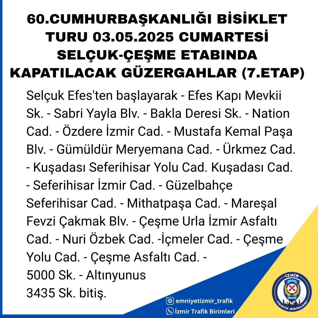 EGEDESONSÖZ- 27 Nisan’da Antalya’da başlayan ve 4 Mayıs’ta İzmir’de sonlanacak 60. Cumhurbaşkanlığı Türkiye Bisiklet Turu’nun 6’ncı, 7’nci ve 8’inci etap güzergâhları Kuşadası, Menderes, Selçuk, Seferihisar, Çeşme, Urla, Güzelbahçe ve Konak’tan geçerek Bostanlı İskelesi’nde sonlanacak. Ulaşım Koordinasyon Merkezi’nin (UKOME) kararı uyarınca 2 Mayıs Cuma, 3 Mayıs Cumartesi ve 4 Mayıs Pazar günleri, İzmir’de yarış güzergahındaki bazı sokak ve yollar trafiğe kapalı olacak.