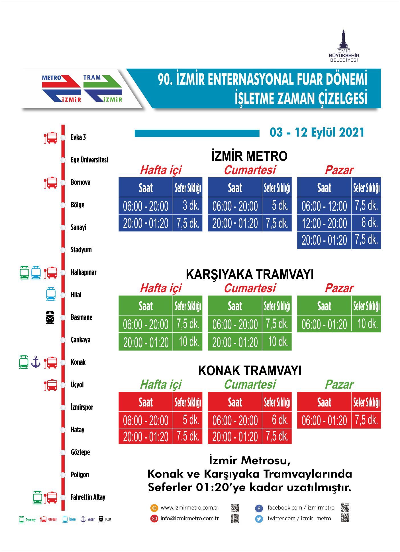 Yeni güncellemeye göre Fuar'ın olduğu 3-12 Eylül tarihleri arasında İzmir Metrosu, Karşıyaka Tramvayı ve Konak Tramvayı'nın sefer saatleri gece 1:20'ye kadar uzatıldı.