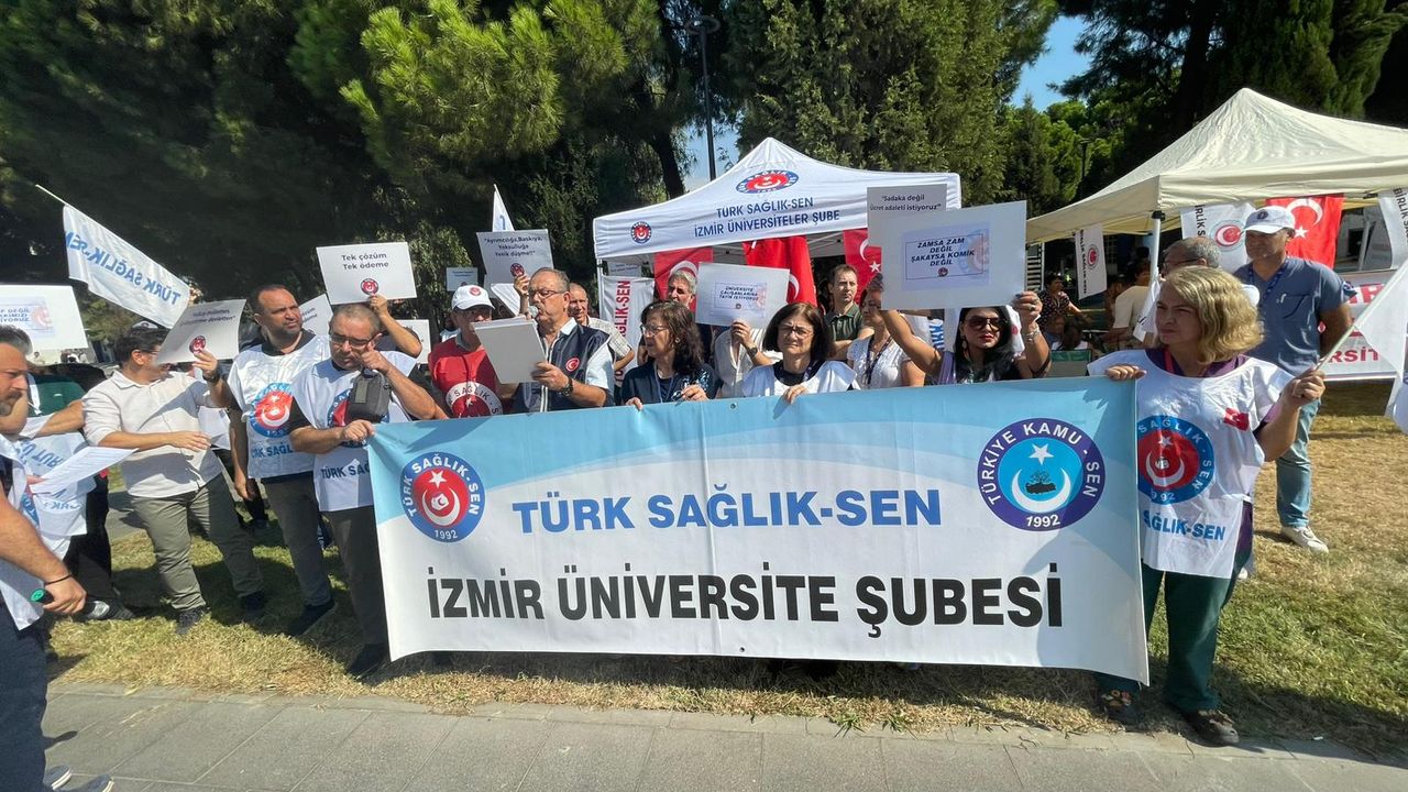 Türk Sağlık-Sen İzmir Üniversiteler Şubesi, Ege Üniversitesi'nde toplanarak işverenin zam önerisine tepki gösterdi. Kamu işveren, emekçilere 2026 yılı için yüzde 10+6, 2027 yılı için yüzde 4+4 oranı önerildi. Cuma günü ise taban aylığa 1000 TL zam eklendi.