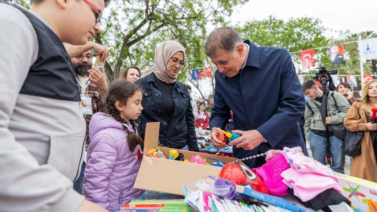 23 Nisan Ulusal Egemenlik ve Çocuk Bayramı programı kapsamında Kültürpark etkinlik alanında çocuklara yönelik “İkinci El Pazarı” kuruldu. Çocukların paylaşma kültürünü deneyimlemesi, üretmenin değerini fark etmesi ve küçük bir alışveriş deneyimi yaşamaları amacıyla düzenlenen pazarda kitaplar, oyuncaklar, spor malzemeleri ve çeşitli eşyalar yeniden kullanıma kazandırıldı. 7–14 yaş arası çocukların katılımına açık olan pazarı İzmir Büyükşehir Belediye Başkanı Dr. Cemil Tugay da ziyaret etti. Çocuklardan oyuncak ve kitap satın alan Tugay, aldığı ürünleri etkinlik alanındaki çocuklara hediye etti.