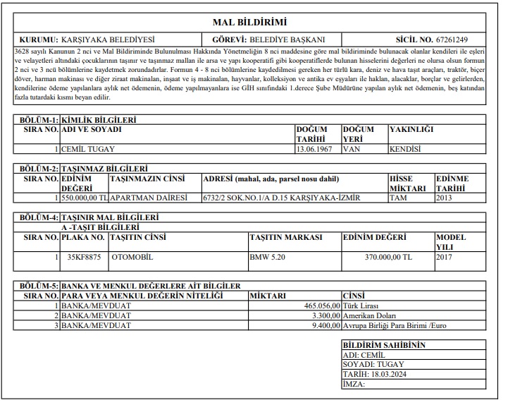 CHP İzmir Büyükşehir Belediye Başkan Adayı Dr. Cemil Tugay'ın seçim ofisinden yapılan açıklamaya göre; Cemil Tugay, 2024 rayicine göre 15 milyon TL değerinde halihazırda oturduğu apartman dairesinin ve 2 milyon 200 bin TL değerinde 2017 model BMW 5.20 marka otomobilin sahibi. Cemil Tugay'ın banka hesaplarında 465 bin 56 Türk Lirası, 3 bin 300 Amerikan Doları, 9 bin 400 Euro nakit parası bulunuyor. Eşi adına kayıtlı menkul veya gayrimenkul mal varlığı bulunmuyor.