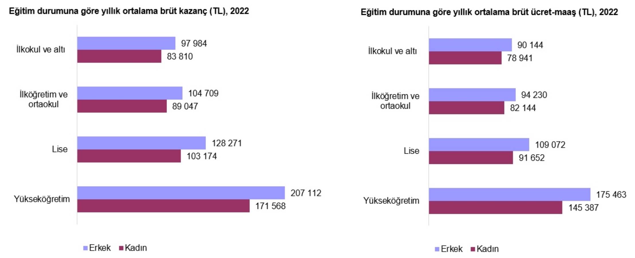 Kazanç düzeylerinin hem erkeklerde hem de kadınlarda eğitim durumu ile doğru orantılı olarak yükseldiği görüldü. Eğitim durumuna göre en yüksek yıllık ortalama brüt kazancı yükseköğretim eğitim düzeyine sahip olanlar elde etti. Bu eğitim düzeyinde yıllık ortalama brüt kazanç erkeklerde 207 bin 112 TL, kadınlarda ise 171 bin 568 TL oldu.