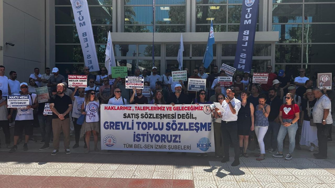 EGEDESONSÖZ - Kamuda 2026-2027 yıllarına yönelik yürütülecek 8'inci dönem toplu sözleşme süreci önce Tüm Bel-Sen İzmir 1 Nolu Şube ve İzmir 2 Nolu Şube taleplerini açıkladı. Kültürpark içerisinde yer alan 1 No’lu Hol önünde gerçekleştirilen açıklamada basın metnini Tüm Bel-Sen İzmir 1 No’lu Şube Başkanı Turgut Angün okudu. Açıklamada sıklıkla “Grevli, özgür, toplu sözleşme”, “Sadaka değil toplu sözleşme”, “Birleşe birleşe kazanacağız” ve “İş, ekmek, özgürlük” sloganları atıldı.