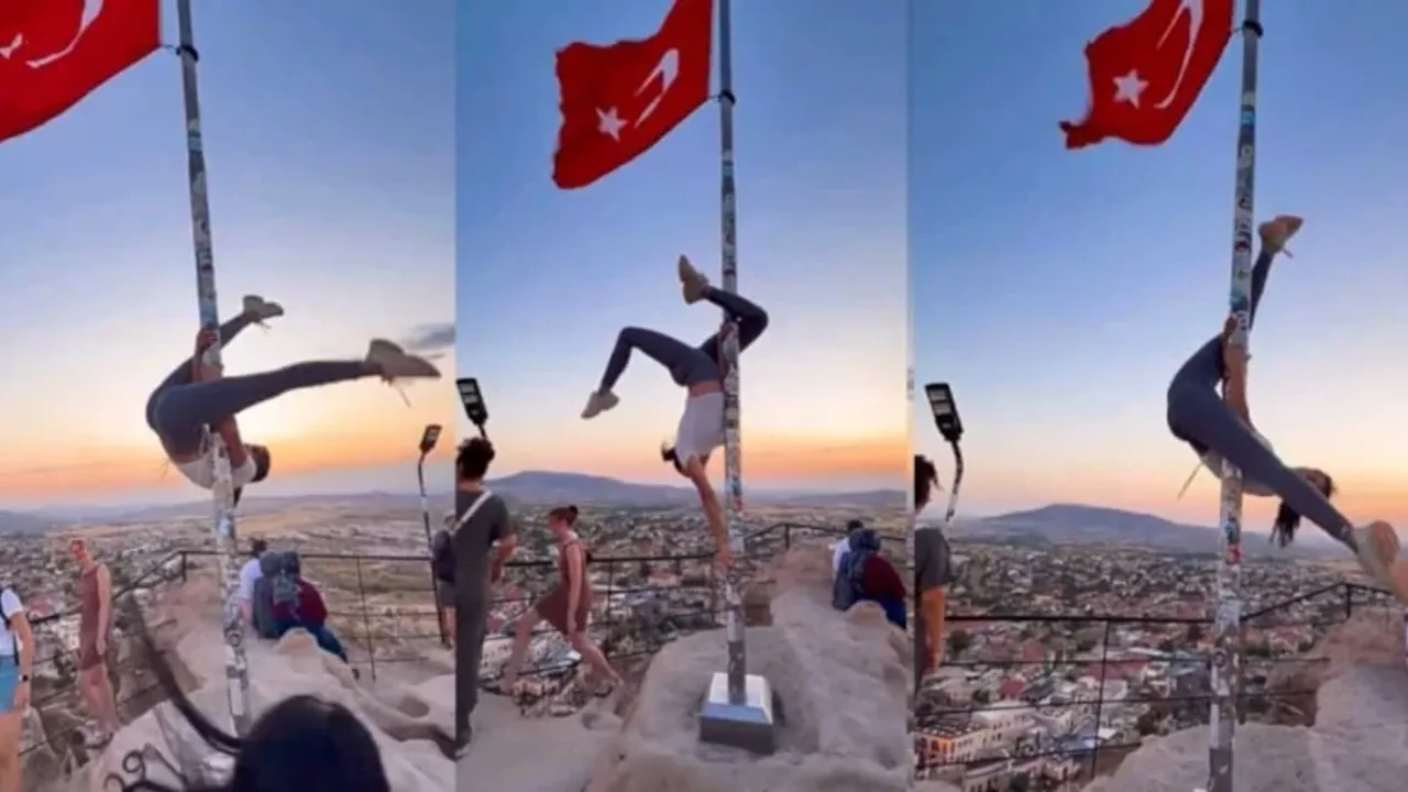 Nevşehir’in Uçhisar beldesinde yabancı uyruklu bir kişinin Türk bayrağı direğinde dans ettiği görüntüler sosyal medyada gündem oldu.