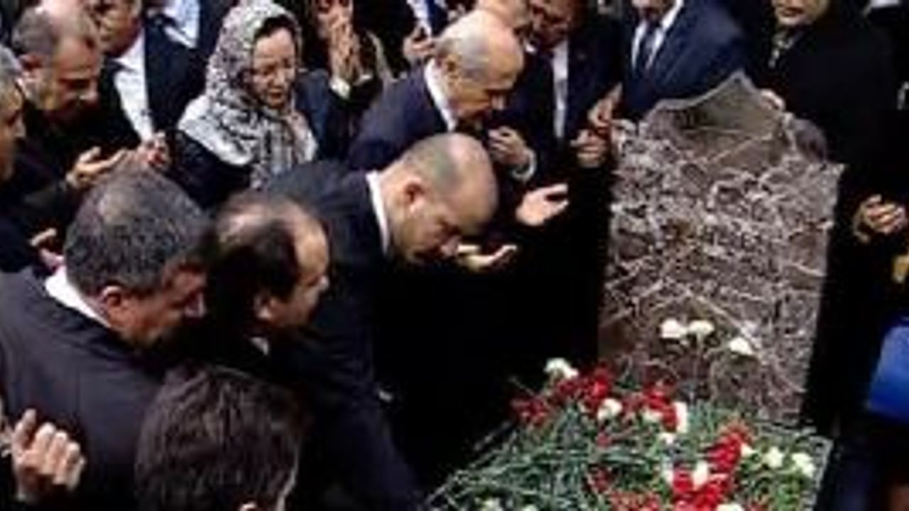 Bahçeli, 'Türkiye'ye sahip çıkmanın, Türk milletini yükseltmenin çaresi Türk milliyetçiliği, karşı karşıya kaldığımız güçlükleri yenecek ve ezecek siyasal adres ise Milliyetçi Hareket Partisi'dir. Merhum Türkeş Bey'i kaybımızdan buyana geçen 16 yıldan sonra da milliyetçi-ülkücü irade ve onu sevenleri buradadır, dimdik ayaktadır ve tüm emanetlerini de bağrına basmaktadır. Gelemeyen milyonların ise yürekleri burada ve bizlerle beraber atmaktadır. Milliyetçi Hareket Partisi, merhum Türkeş Bey'den devraldığı seviyeli, ilkeli, tutarlı siyaseti ile Türkiye'mizi, 21. yüzyılda lider ülke olma hedefine inşallah ulaştıracak ve Türk milletinin önündeki tüm bariyerleri bir bir yıkacaktır. Bu vesile ile kalplerimizdeki yeri, gönlümüzdeki zirvesi hiç değişmeyecek olan Merhum Başbuğumuz Alparslan Türkeş Bey'i ve aziz ülkü şehitlerini saygı, sevgi ve rahmetle yad ediyorum. Bu mukaddes borcu ifa ederken, merhum liderimizin kabrinin nur, mekanının Cennet olmasını Cenab-ı Allah'tan diliyorum. Konuşmamı merhumun bir sözüyle sonlandırıyorum: 'Hepiniz birer Türk Bayrağı'sınız. Bayrağı lekelemeyin, kirletmeyin ve yere düşürmeyin.' diye konuştu.