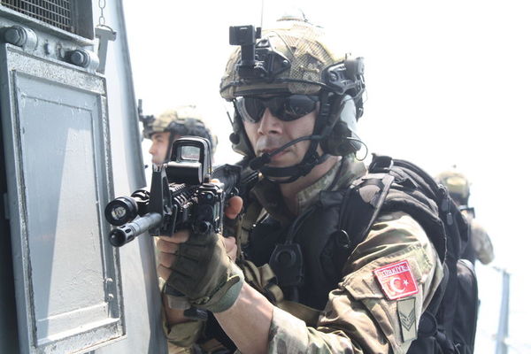 Türk Donanma Komutanlığına bağlı TCG Gökova Fırkateyni, iki ülkenin ortaklaşa düzenleyeceği deniz tatbikatlarına katılmak üzere 214 kişiden oluşan askeri birliğiyle 31 Temmuz'da Hamed Limanı'na ulaşmıştı. (AA)