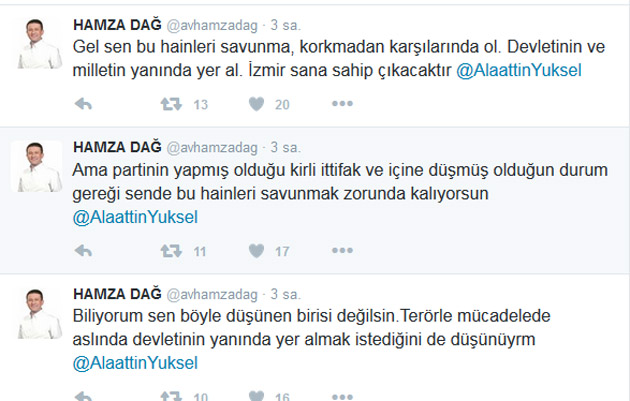 Dağ, Yüksel'e şu ifadelerle seslendi: Biliyorum sen böyle düşünen birisi değilsin. Terörle mücadelede aslında devletinin yanında yer almak istediğini de düşünüyorum… Ama partinin yapmış olduğu kirli ittifak ve içine düşmüş olduğun durum gereği sende bu hainleri savunmak zorunda kalıyorsun… Gel sen bu hainleri savunma, korkmadan karşılarında ol. Devletinin ve milletin yanında yer al... İzmir sana sahip çıkacaktır…