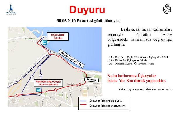 ESHOT Genel Müdürlüğü'nden yapılan duyuruda '30 Mayıs 2016 pazartesi günü, başlayacak inşaat çalışmaları nedeniyle Fahrettin Altay bölgesindeki bazı hatlarda değişiklik yapıldığı'nı bildirdi. Buna göre son durağı Fahrettin Altay Aktarma Merkezi olan 10 No'lu Konak, 17 No'lu Uzundere Toplu Konutları, 24 No'lu Kavacık ve 25 No'lu Olimpiyat Evleri otobüsleri artık Üçkuyular İskele'den kalkacak.