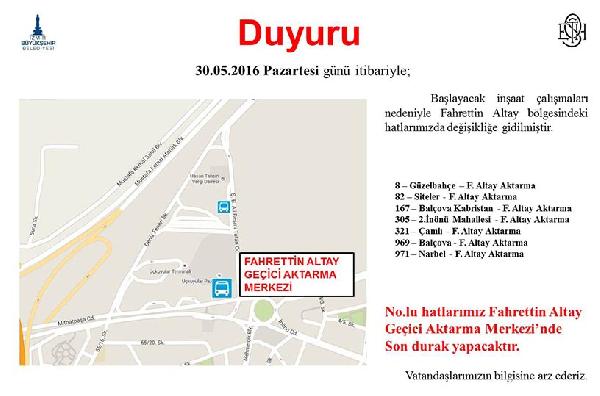 Uygulama kapsamında Mithatpaşa Caddesi üzerinde pazaryeri önünde oluşturulan F. Altay Geçici Aktarma Merkezi'nden ise 8 No'lu Güzelbahçe, 167 No'lu Balçova Kabristan, 305 No'lu İkinci İnönü, 321 No'lu Çamlı,969 No'lu Balçova ve 971 No'lu Narbel otobüsleri hareket edecek.