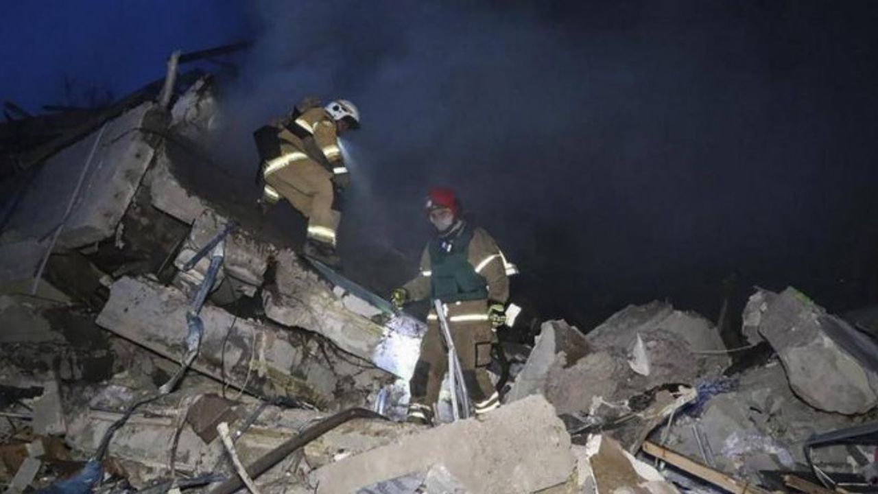 Ukrayna Devlet Başkanı Volodomir Zelenski tarafından paylaşılan videoda arama kurtarma çalışanlarının iki katlı bir binanın enkazında çalışmalar yaptığı görülüyor.