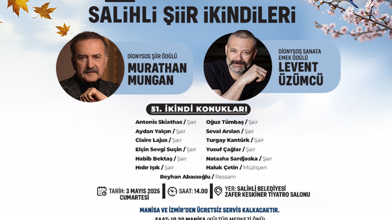 Yılda iki kez, ilkbahar ve sonbahar dönemlerinde düzenlenen etkinlik, 3 Mayıs 2025 Cumartesi günü saat 14.00’te, Salihli Belediyesi Zafer Keskiner Tiyatro Salonu’nda başlayacak. Şair ve Yazar Tuğrul Keskin editörlüğünde düzenlenen Salihli Şiir İkindileri’nin bu yılki programında, edebiyat ve sanat dünyasından önemli isimler yer alacak. Bu yıl etkinliğe şairler Antonis Skiathas, Aydan Yalçın, Claire Lajus, Elçin Sevgi Suçin, Habib Bektaş, Hıdır Işık, Natasha Sardjoska, Oğuz Tümbaş, Seval Arslan, Turgay Kantürk ve Yusuf Çağlar katılacak. Ayrıca, etkinlik kapsamında, ressam Reyhan Abacıoğlu’nun resim sergisi sanatseverlerle buluşacak, müzisyen Haluk Çetin ise “Şiir İçi Şarkılar” temalı özel bir konser verecek.