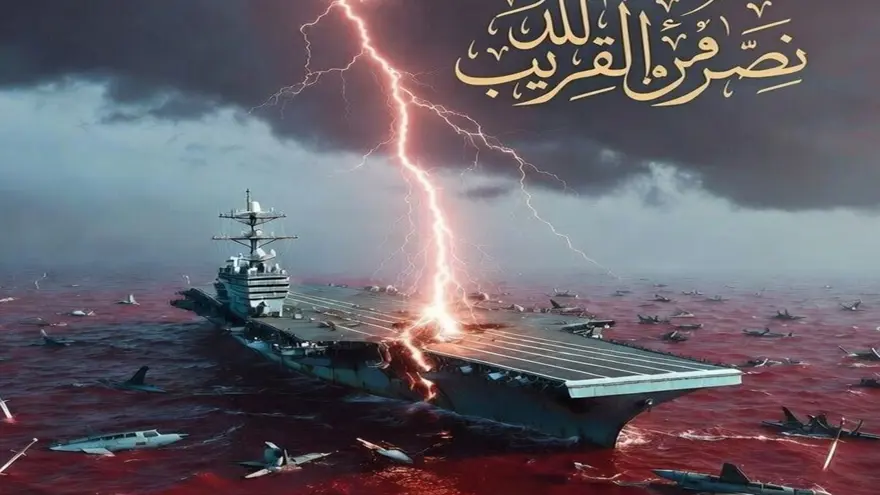 İran Devrim Muhafızları Ordusu dün USS Abraham Lincoln uçak gemisini hedef alan bir görsel paylaşmıştı. Görselde, uçak gemisinin fırtınalı ve kan kırmızısı tonların hakim olduğu bir denizde hedef alındığı sahne yer aldı. Paylaşımda, uçak gemisine isabet eden bir yıldırımın yanı sıra ABD'ye ait savaş uçaklarının denize düşerek batmış şekilde tasvir edildiği, denize saplanmış kılıç figürlerinin öne çıktığı görüldü. Görselde ayrıca Saf Suresi'nin 13'üncü ayeti olan "Allah'tan bir yardım ve yakın bir fetih" ifadesine yer verildi.
