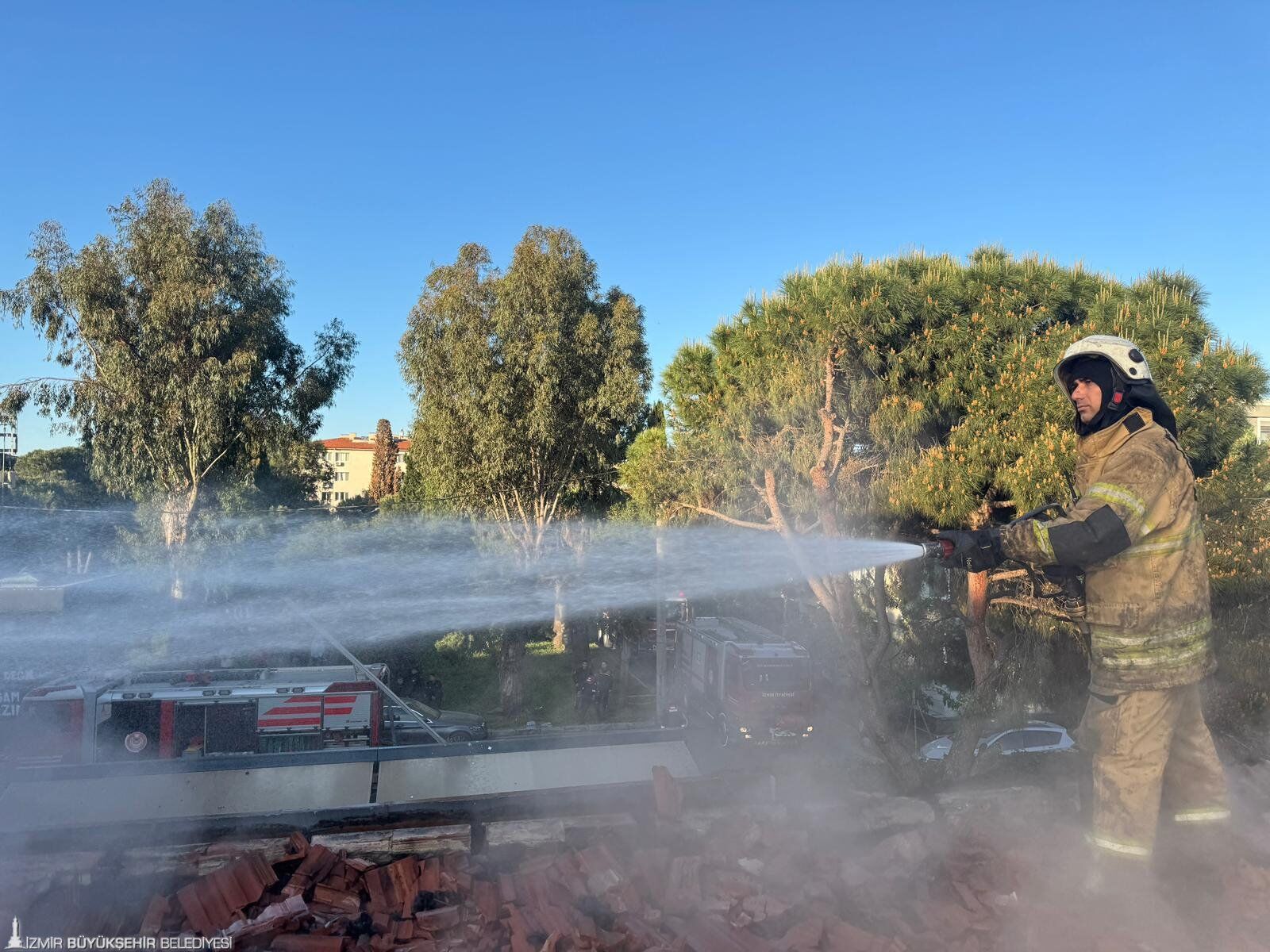 İzmir’in Karşıyaka ilçesi Bostanlı Mahallesi Cengiz Topel Caddesi’nde bulunan bir restoranın çatı kısmında çıkan yangın korku yarattı. Yangın, rüzgârın da etkisiyle bitişikte bulunan eve sıçradı. İhbar üzerine İzmir Büyükşehir Belediyesi İtfaiye Dairesi Başkanlığı ekipleri hızla olay yerine sevk edildi. Saat 05.50’de ilk aracın çıkış yaptığı, 05.55’te ise olay yerine ulaşıldığı, ayrıca ilk müdahalenin ardından Bostanlı ve Karşıyaka’dan sevk edilen ekiplerle birlikte yangına toplam 11 araçla müdahale edildiği bildirildi. Belediyeye ait 2 su tankerinin de desteğiyle alevleri kontrol altına almak için yoğun çaba harcandı.