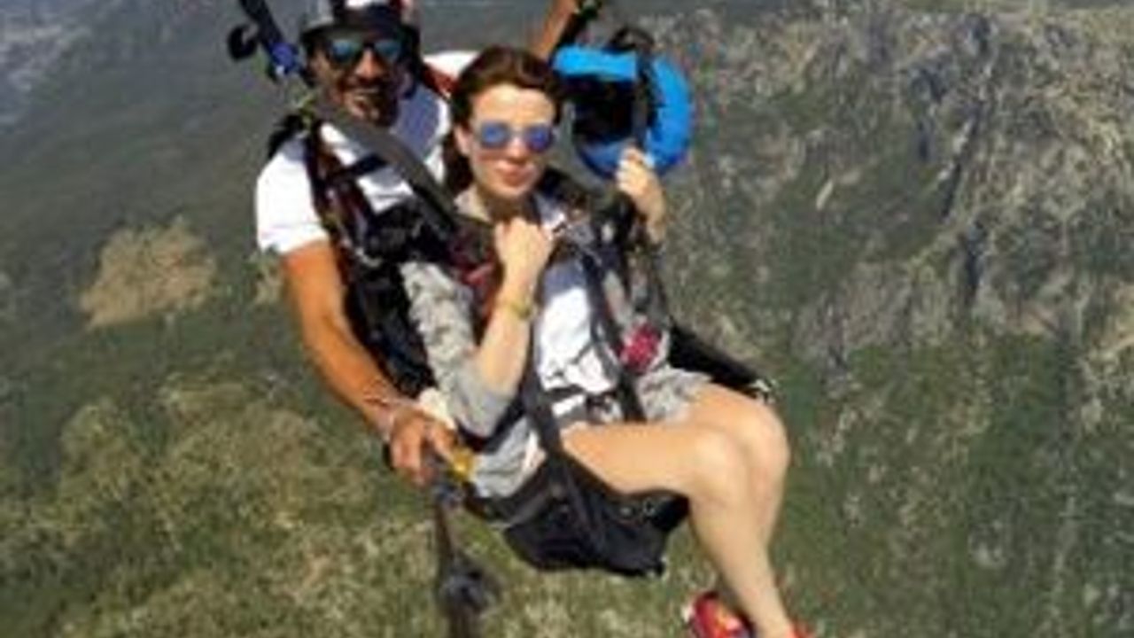 Pilot Sebahattin Kılıç'a 'Sebo' diye seslenen Başak Parlak, yükseklik ve uçuşun detayları hakkında bilgi aldı. Parlak, pilotuyla gökyüzünde şarkı da söyledi. Ölüdeniz üzerine geldiğinde pilotun yaptığı akrobatik hareketler Parlak'ı heyecanlandırdı. Daireler çizerek hızla alçalan paraşütte cesaretiyle dikkati çeken güzel oyuncu, çığlıklar attı. 1 saat 10 dakika havada kalan Parlak, Belceğiz Plajı'na sorunsuz indi.