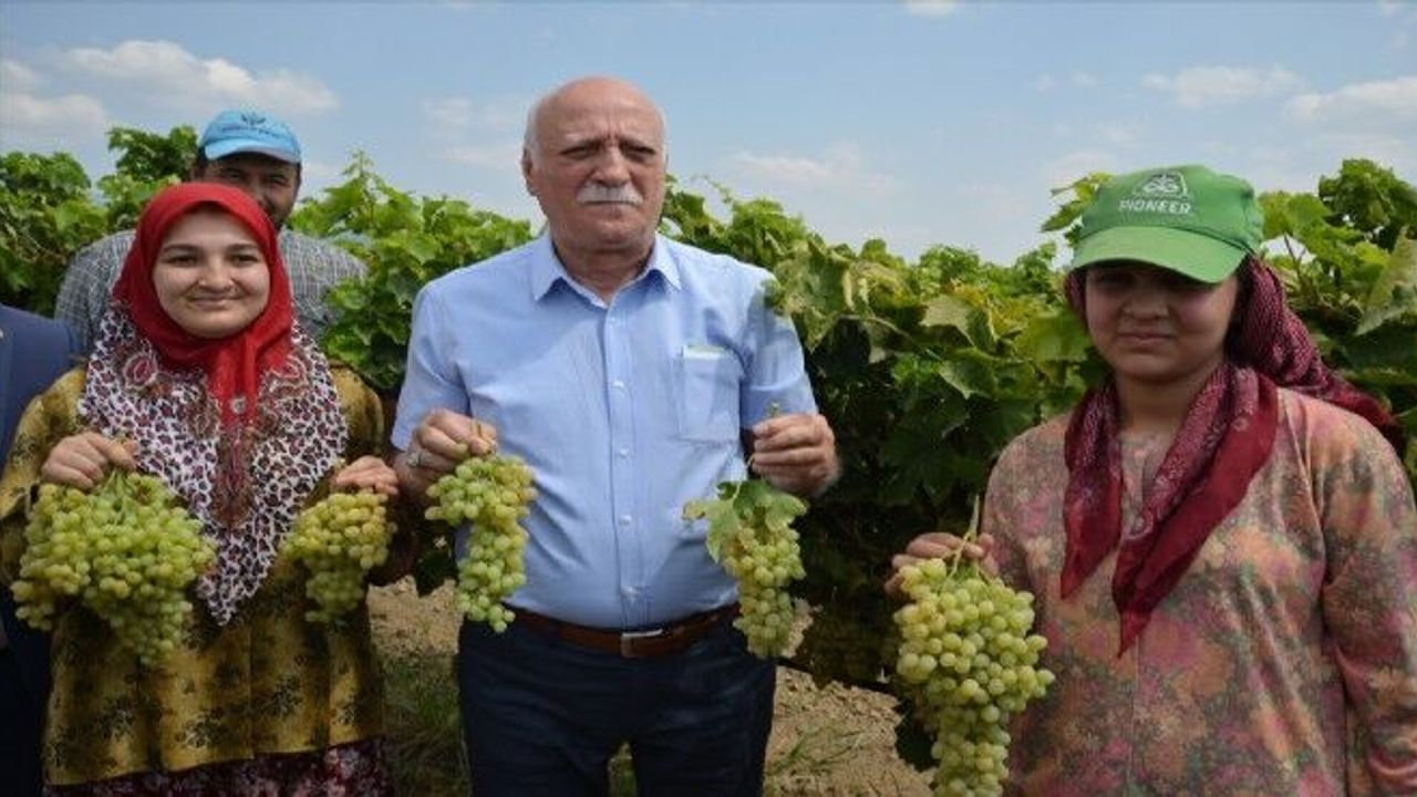 Bayraktar, Turgutlu Ovası'ndaki bir bağda, üreticilerle üzüm kesti, üzüm kurutma çalışmalarını inceledi.