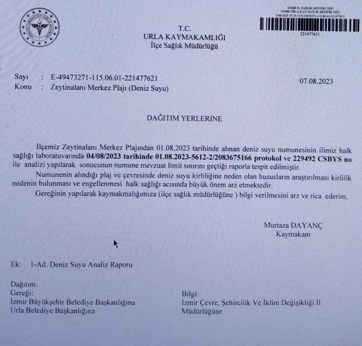 Rapor sonrası, Urla Kaymakamı Murtaza Dayanç, İzmir Büyükşehir Belediyesi ve Urla Belediyesi'ne 7 Ağustos 2023 tarihinde gönderdiği yazı ile Zeytinalanı plajı ve çevresinde deniz suyu kirliliğine neden olan etkenlerin araştırılmasını istedi.
