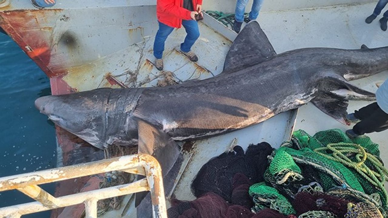 Gelinkaya açıklarında yakalanan köpek balığının 8,5 metre olduğu bildirildi. Köpek balığı vinçlerle karaya çekildi.