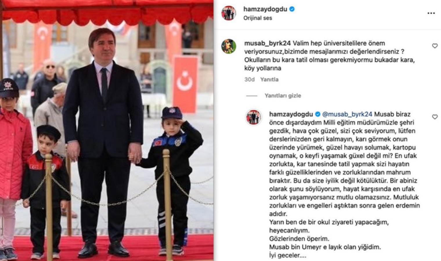 Sosyal medya üzerinden Vali Hamza Aydoğdu'nun paylaşımına yorum yaparak kar tatili isteyen Musab isimli öğrenci, 'Valim hep üniversitelilere önem veriyorsunuz, bizim de mesajlarımızı değerlendirseniz. Okulların bu kara tatil olması gerekmiyor mu? Bu kadar kara köy yollarına' dedi.